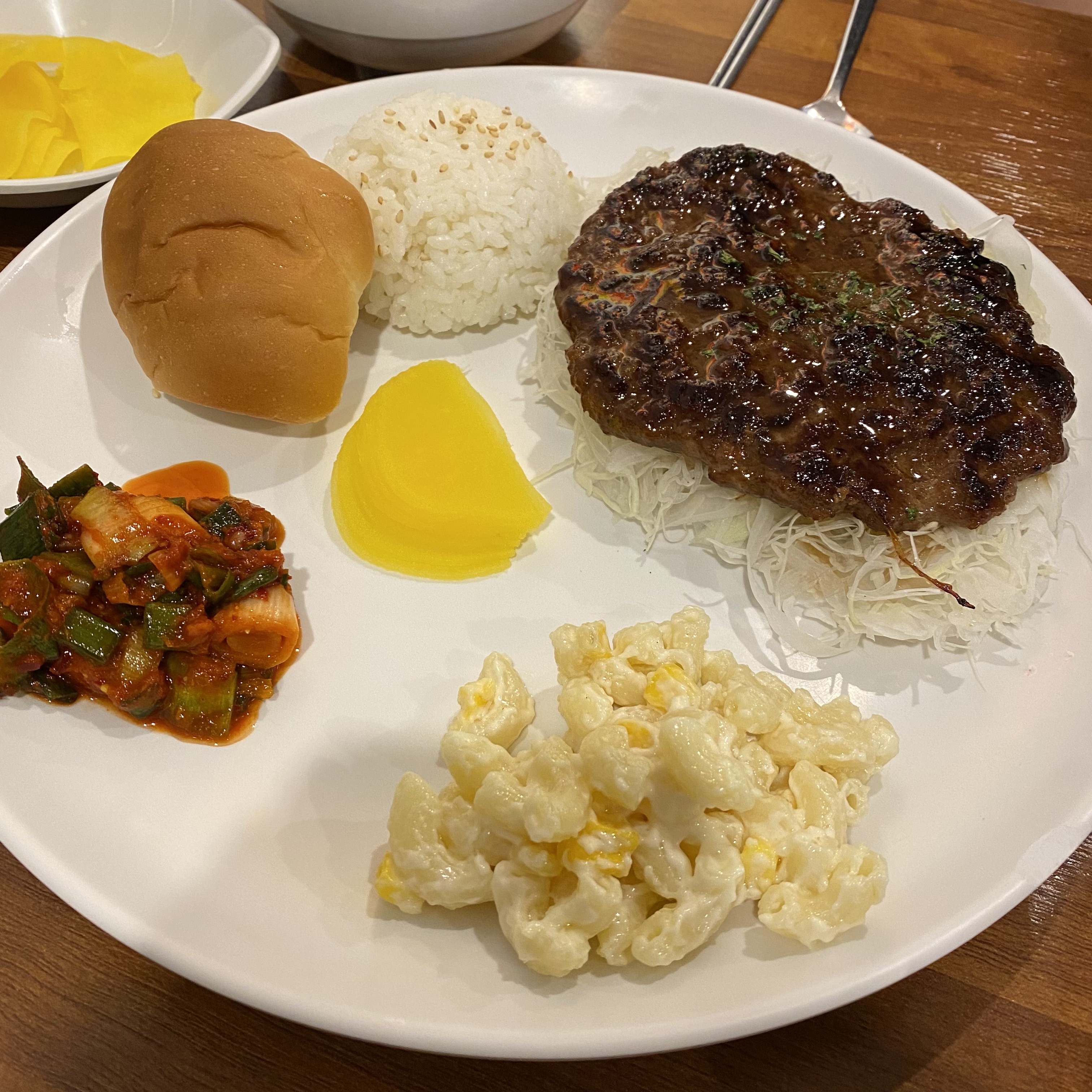 떡갈비 한 덩이가 양배추채에 올려져서 나온다.