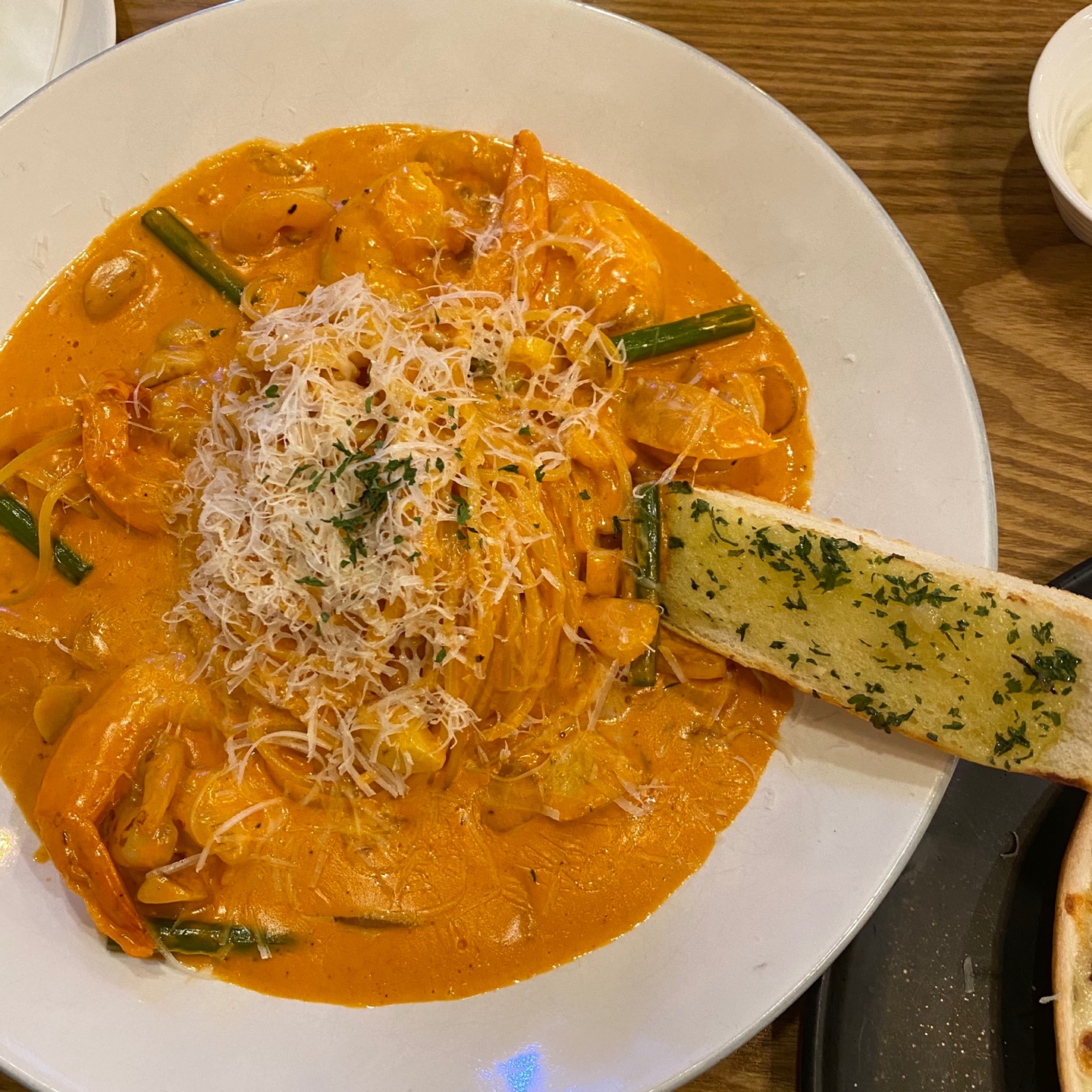 두 번째 파스타는 "새우 로제 파스타"입니다.